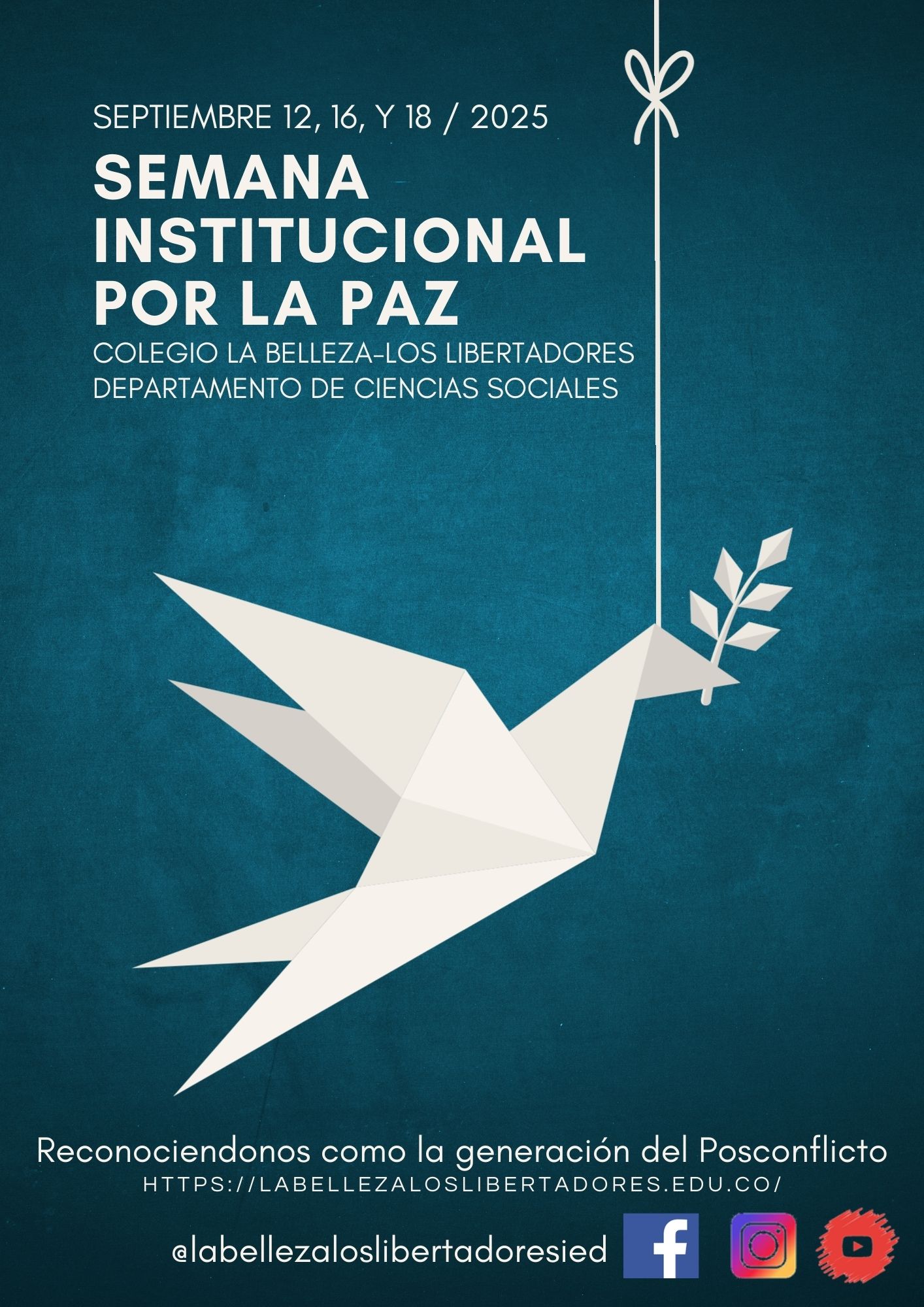 Desde el Departamento de ciencias sociales se viene preparando nuestra #SemanaporlaPaz2025; un espacio de diálogo, debate y reflexión frente la resolución pacífica de los conflictos, la construcción de memoria desde el contexto escolar y el reconocimiento de nuestro territorio. Este espacio tendrá lugar los días 12, 16, y 18 de septiembre. Te esperamos